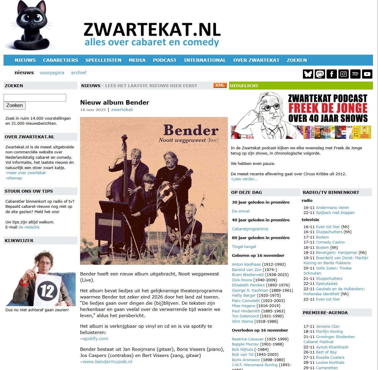 Op de befaamde Kleinkunst site van Zwarte Kat wordt de nieuwe plaat van Bender ook onder de aandacht gebracht. Daar zijn we heel blij mee! Zie ook ZWARTE KAT.NL